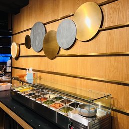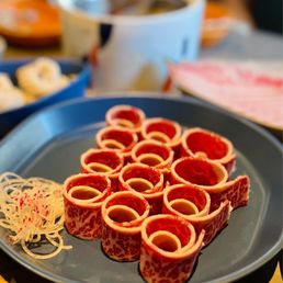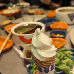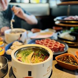 I have eaten at many hotpot places but this was one of the best. The service makes you feel like a very important guest and the interior of the restaurant feels cool and modern. As others have mentioned, this place can get quite expensive. However, I feel they are overlooking the fantastic deal available with the individual "sets" available. When selecting a set, the fee for the broth is included, as well as the fee for using the "sauce bar" and you get a pretty large quantity of food. I dined with two other people and we each ordered our own set plus an additional plate of lamb, frozen tofu and some fresh bamboo shoots a la cart. We were stuffed by the end and the total came out to around $50 a person. If you're attempting to eat here on a budget, the sets are definitely the way to go. I initially found it sort of silly that you need to pay per person to use the sauce bar here if you don't get a pre set meal, but the sauce bar is really so much more than that. It's a long table with fresh fruit and snacks and cold salads in addition to the sauces and you definitely could fill up on stuff from here if you found your pre set meal didn't include enough food. However, the plate of meat they give you per person is quite large. The hallmark of a good hot pot spot for me, is whether or not the broth is able to sufficiently season your food. Some cheaper places leave you leaning on your sauce to season every bite, but here, it's possible to enjoy without covering everything in sauce. We ordered a plate of bamboo shoots in addition to our sets and I have never had fresh bamboo like this before. It was so delicious, like a subtly sweet tender asparagus. The meat was all tender and high quality and the vegetable plate seemed well portioned for one person. It also included some shrimp paste which I've never tried before. When cooked it created a beautiful bouncy shrimp ball which I really enjoyed. I had a great time here and will definitely come back as I am intrigued by the all you can eat deal they begin offering late night. The soft serve ice cream cone they offer you at the end is just the icing on the cake!