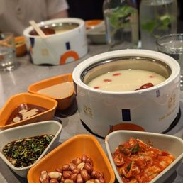 Rating: 3.5 stars My friend and I stopped by on a Friday night at 8:30 PM and the restaurant was completely packed. I thankfully had made a reservation so we were seated a couple of minutes after we arrived in a comfortable side booth for two. Service was fast and our server was super nice. You order everything on the iPad but the total of everything was quite hefty especially for the amount of food you get. For my broth, I got the creamy pork broth and tomato broth. The tomato broth was disappointing since it was super watered down. However, the pork broth was so delicious, I would recommend just getting the pork broth next time. For meats we only ordered a ribeye. The quality of the ribeye we got was so good. It was shaved so thinly that it cooked in only a few seconds and was perfect. We got other items as well like veggies and meat/fish balls which were all very tasty but pretty much like all other hot pot places in the city. I did really like their sauce and dessert station. There was a great selection of sauce choices. And the tiny cut fruit, fermented sweet rice and popping jelly were such a great end to a meal. The main issue I had though was that the floor of the restaurant especially around the sauce area was super sticky and gross. I'm sure it is hard to clean with so many customers around but would be nice to be more mindful of it. All in all, a nice hot pot location but not sure if the hefty price tag is fully worth it.